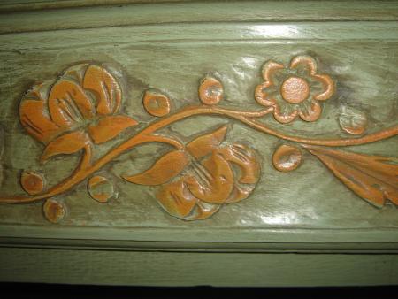 Empruntant à la flore, ici, le travail des ébénistes de cette époque est reconnaissable à la flore typiquement " Provence Lanquedocienne" . C'est d'ailleurs à cette même époque que le fameux vernis des Frères MARTIN naît. ( Copié à la base sur les laques chinoise)